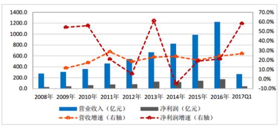 2008-2017年環(huán)保行業(yè)上市公司營收及凈利潤變化情況